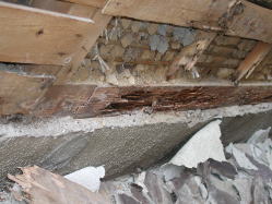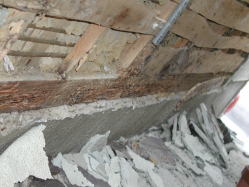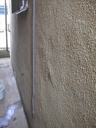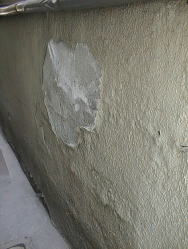 土間からの湿気で外壁の塗装が捲れており、モルタルも木下地から剥離している状態。